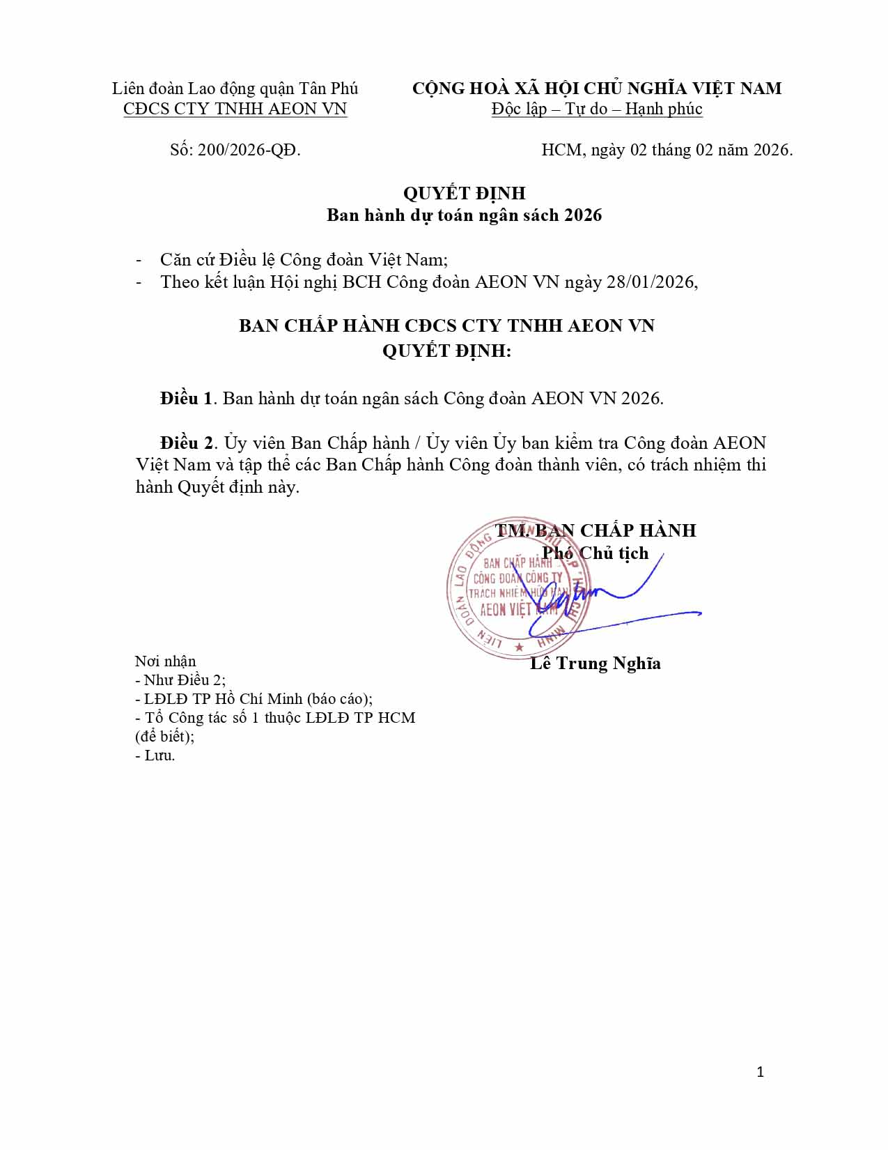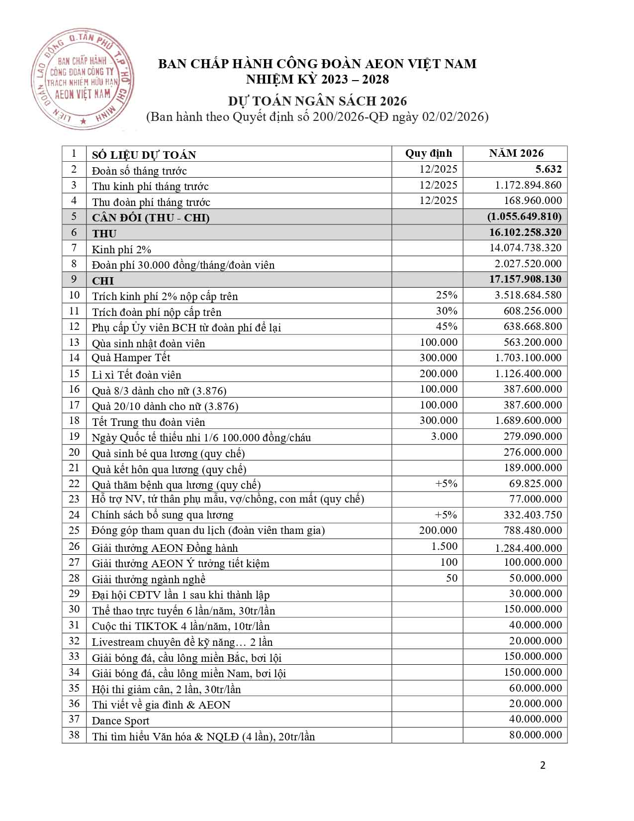 Nội bộ Dự toán thu chi ngân sách Công đoàn AEON VN năm 2026. 30/10/2025 141 CÔNG ĐOÀN AEON VN HỘP THƯ HẠNH PHÚC